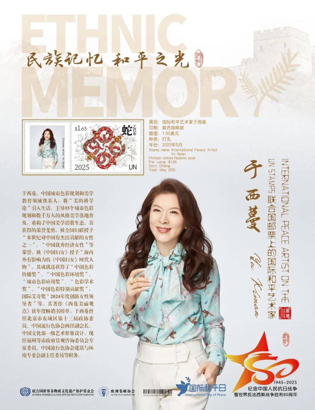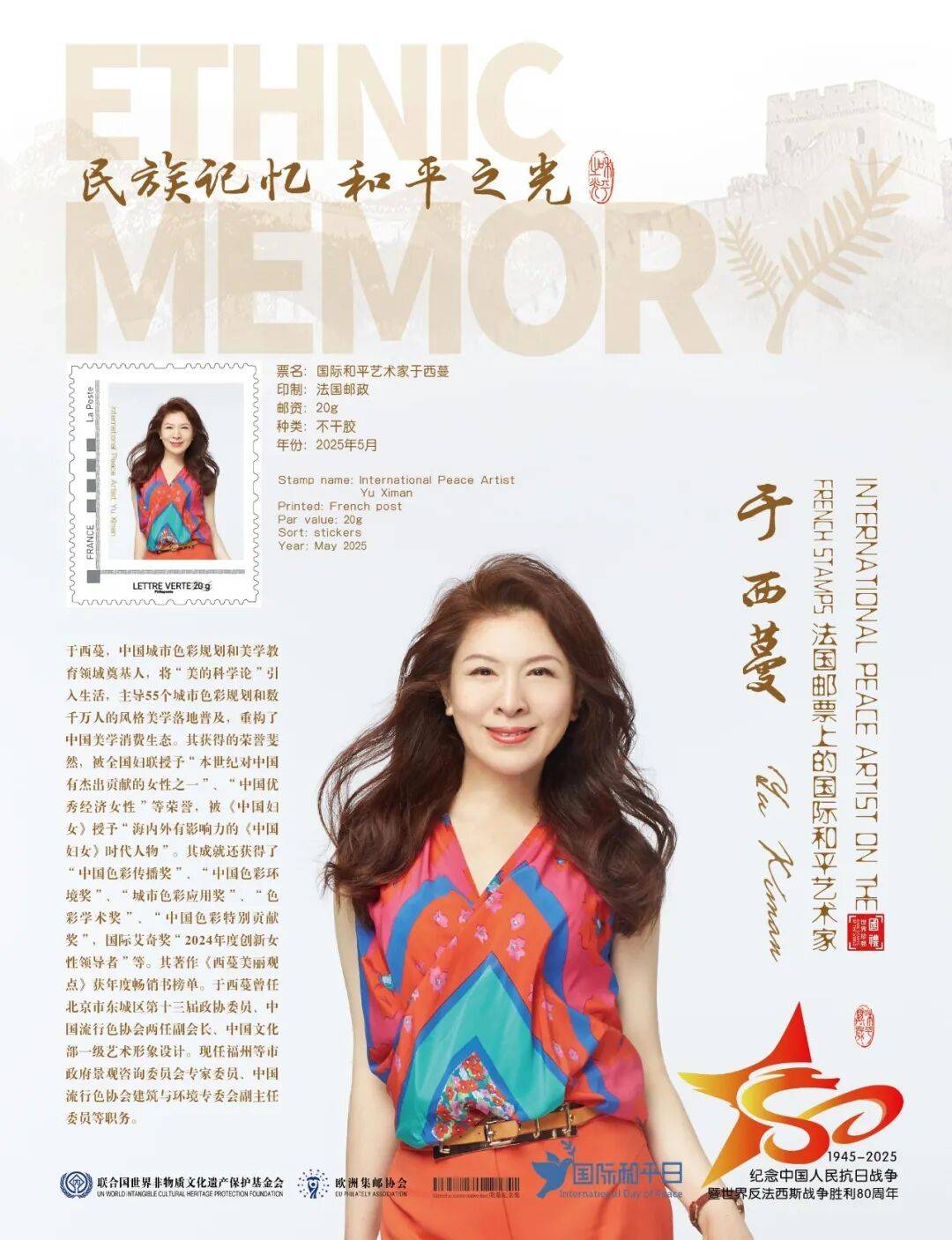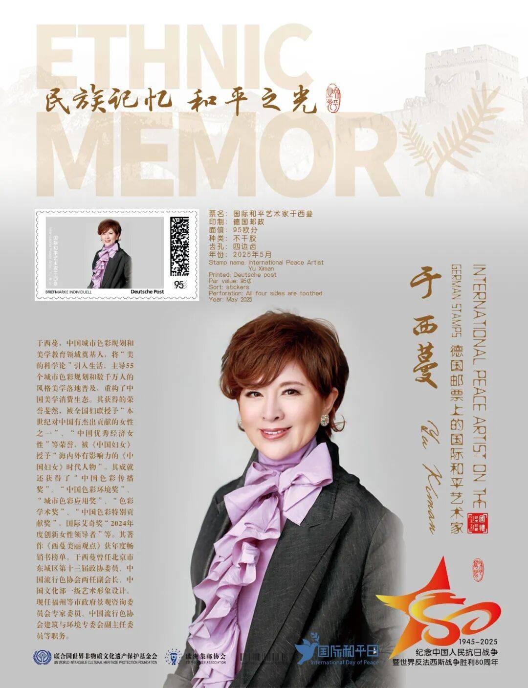 同时,联合国邮政、德国邮政、法国邮政、荷兰邮政为中国色彩名家于西蔓在全球公开发行一套以纪念中国人民抗日战争暨世界反法西斯战争胜利80周年“民族记忆 和平之光——国际和平艺术家”为主题的邮票与珍藏册。以邮为媒,方寸之间让世界各地的人们感受到爱与和平的力量,并为世界和平发展注入新能量。