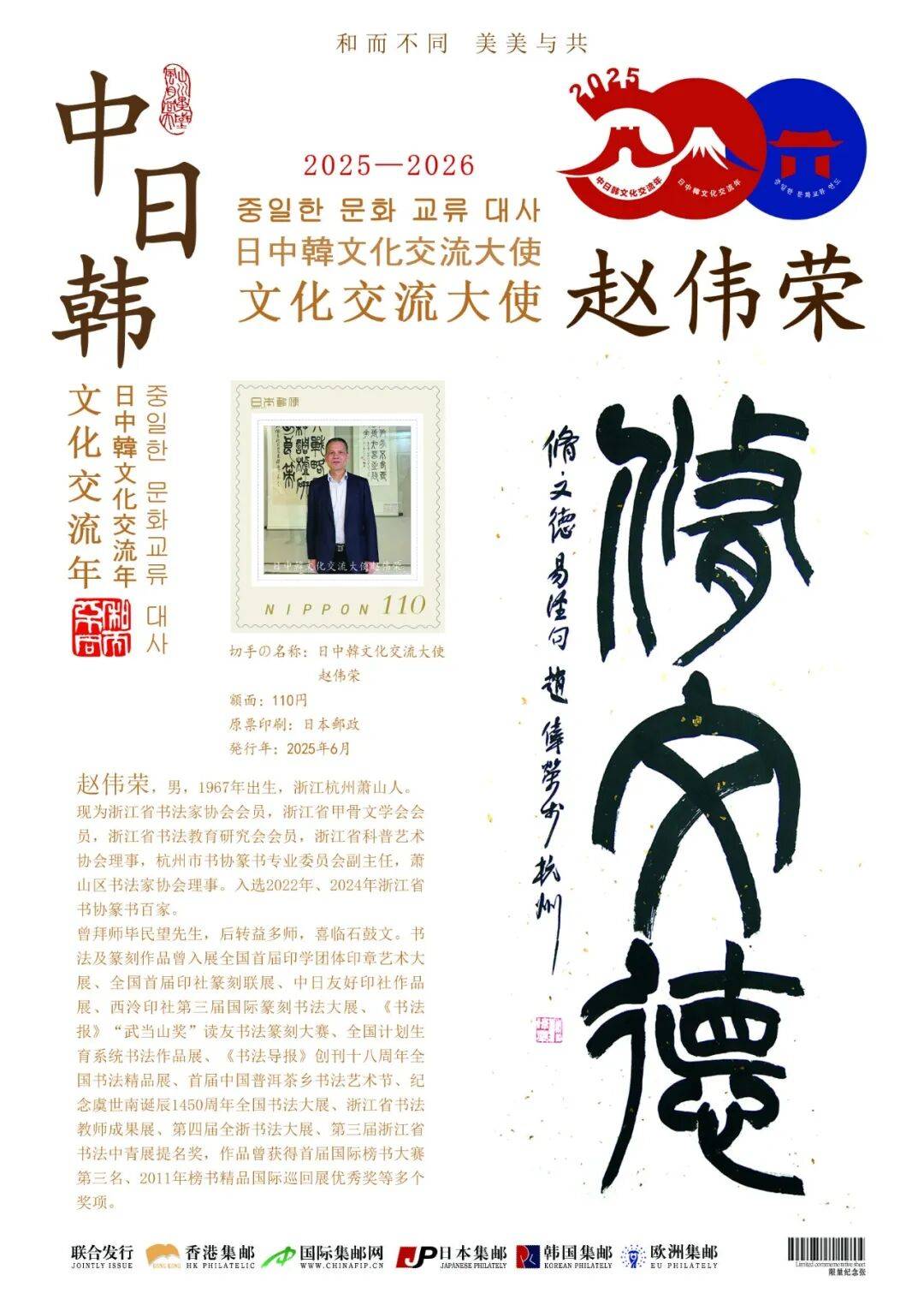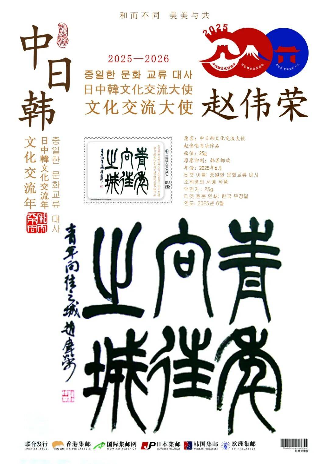 邮票是“国家名片”,是文化传播的重要载体。如今,赵伟荣作为中国文化的优秀代表人物推荐登上日本、韩国国家邮政公开发行的邮票主票上。进一步展现中国文化的独特魅力,促进三国间文化互鉴与融合,和而不同,为推动中日韩三国友好关系和世界文化多样性发展贡献力量。