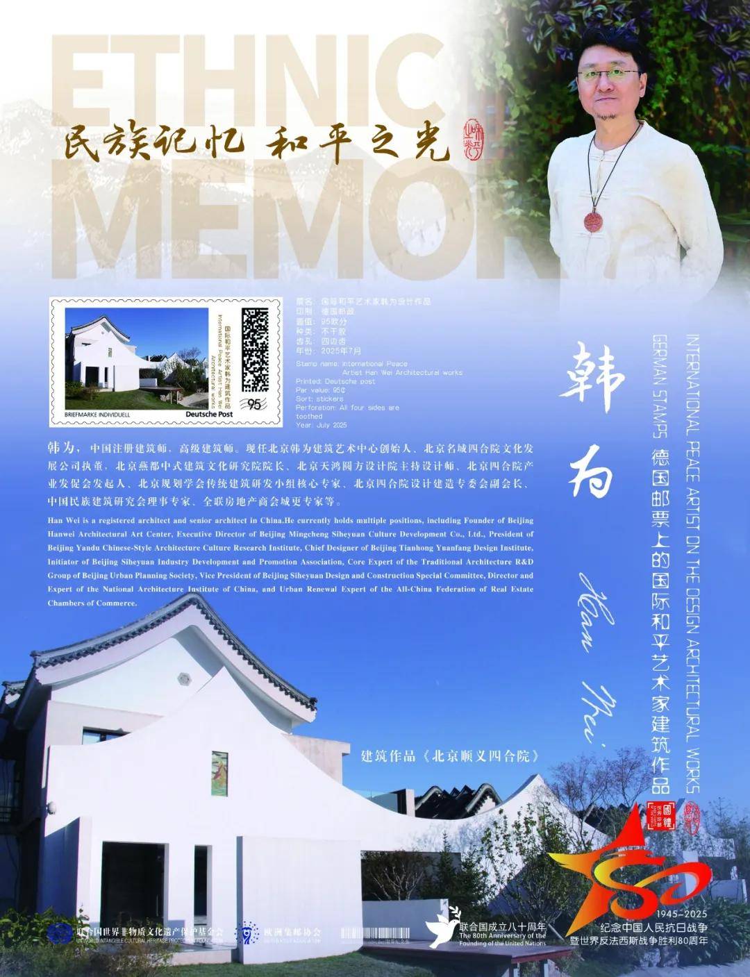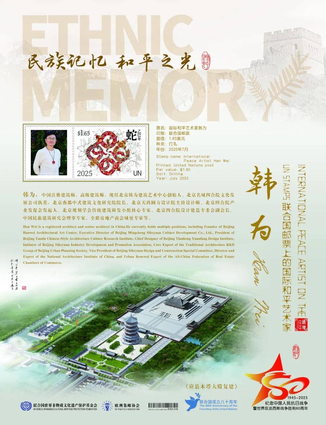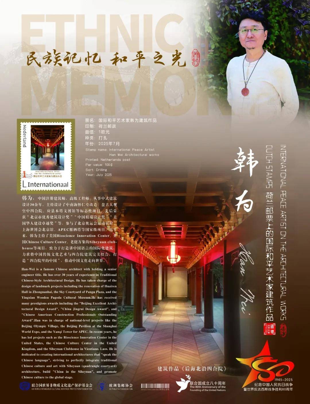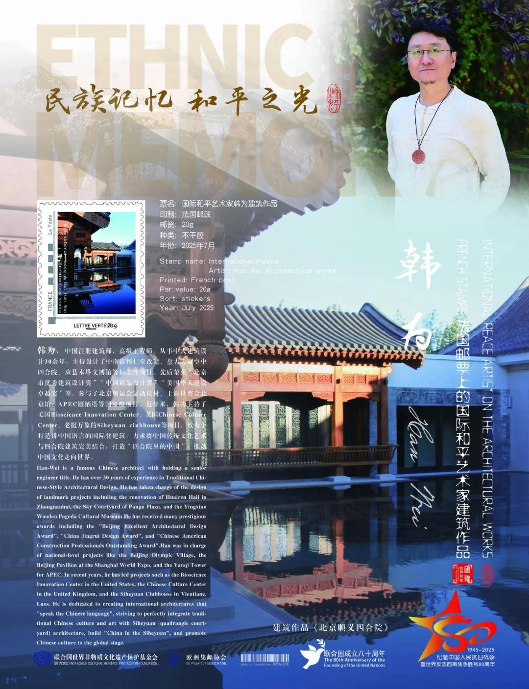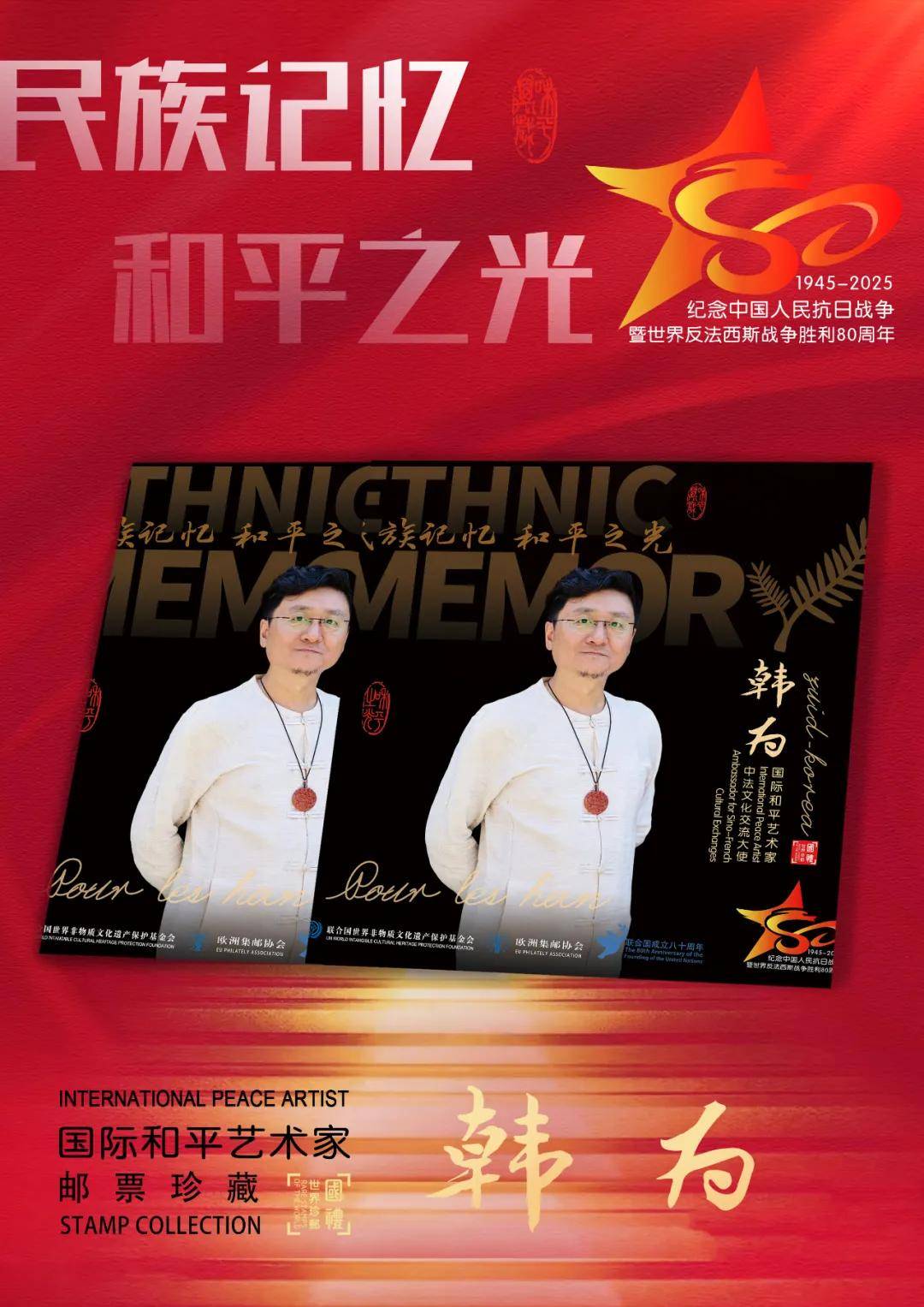 同时,联合国邮政、德国邮政、法国邮政、荷兰邮政为中国建筑设计名家韩为在全球公开发行一套以纪念中国人民抗日战争暨世界反法西斯战争胜利80周年“民族记忆 和平之光——国际和平艺术家”为主题的邮票与珍藏册。以邮为媒,方寸之间让世界各地的人们感受到爱与和平的力量,并为世界和平发展注入新能量。