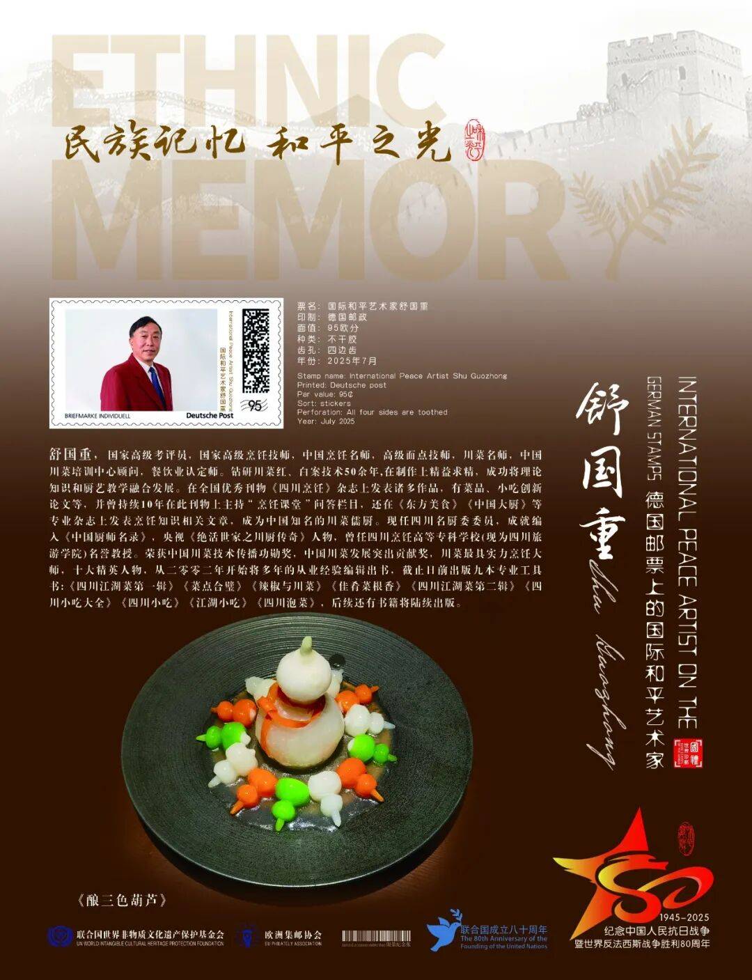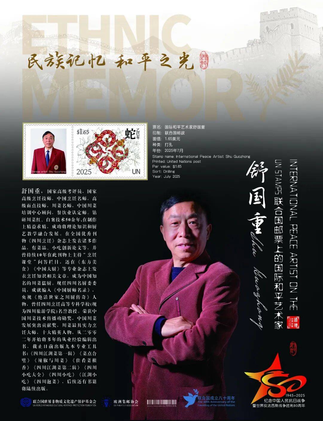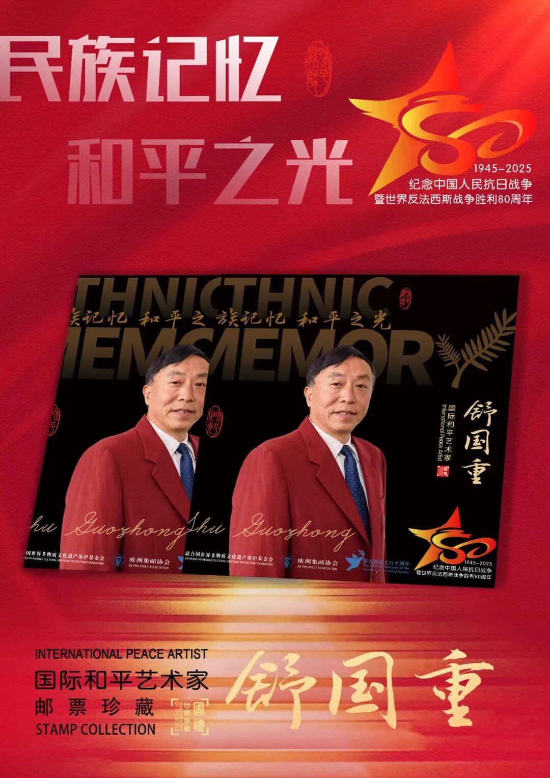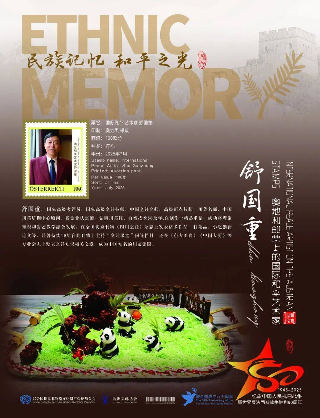 同时,联合国邮政、德国邮政、荷兰邮政、奥地利邮政为中国烹饪名家舒国重在全球公开发行一套以纪念中国人民抗日战争暨世界反法西斯战争胜利80周年“民族记忆 和平之光——国际和平艺术家”为主题的邮票与珍藏册。以邮为媒,方寸之间让世界各地的人们感受到爱与和平的力量,并为世界和平发展注入新能量。