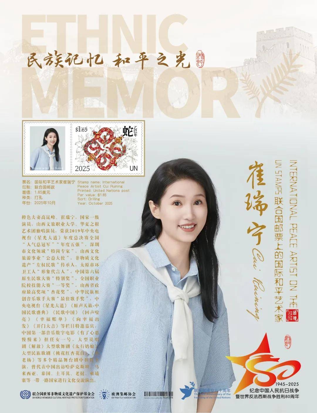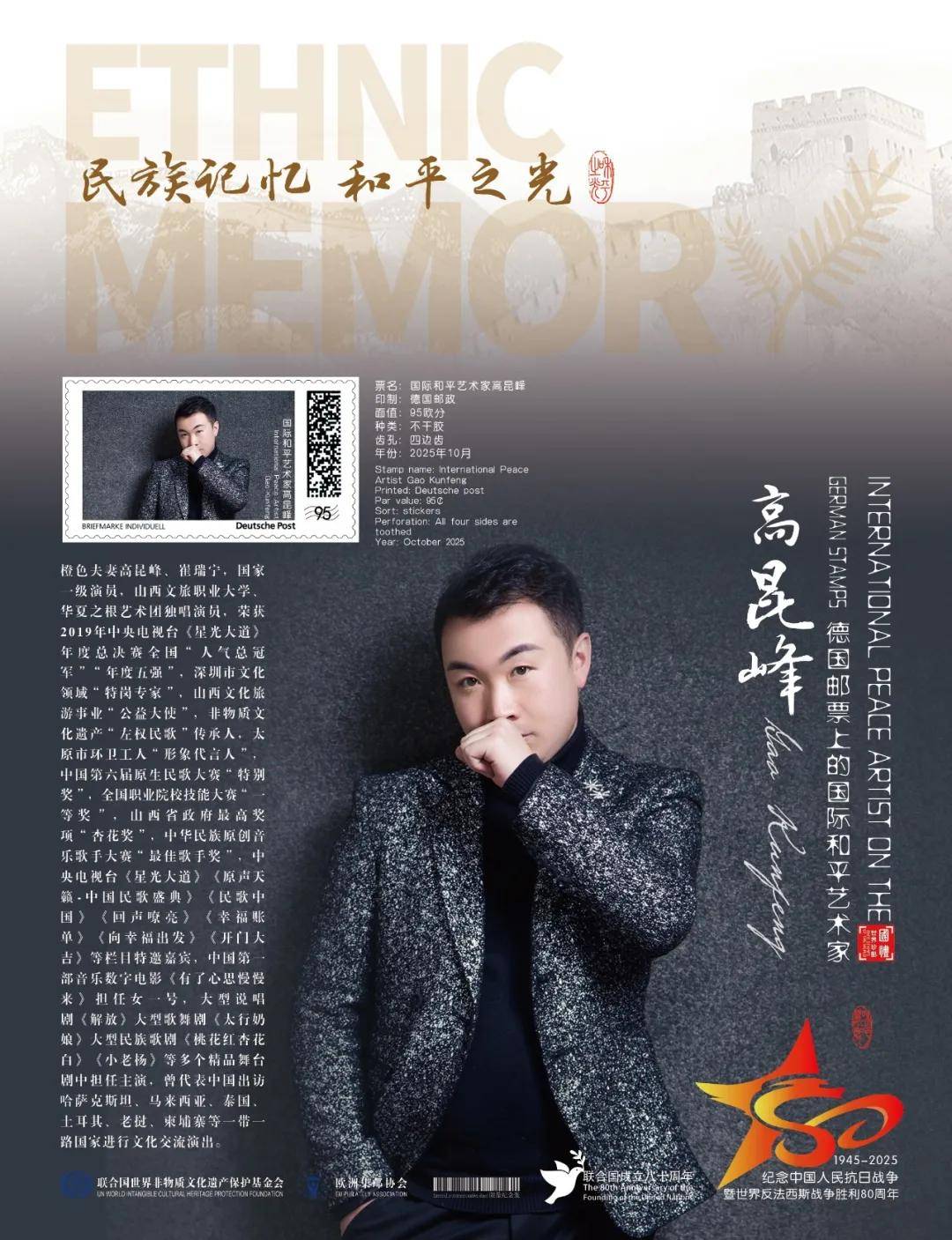 同时,联合国邮政、德国邮政、法国邮政、荷兰邮政为山西文化旅游职业大学“橙色夫妻”高昆峰、崔瑞宁在全球公开发行一套以纪念中国人民抗日战争暨世界反法西斯战争胜利80周年“民族记忆 和平之光——国际和平艺术家”为主题的邮票与珍藏册。以邮为媒,方寸之间让世界各地的人们感受到爱与和平的力量,并为世界和平发展注入新能量。