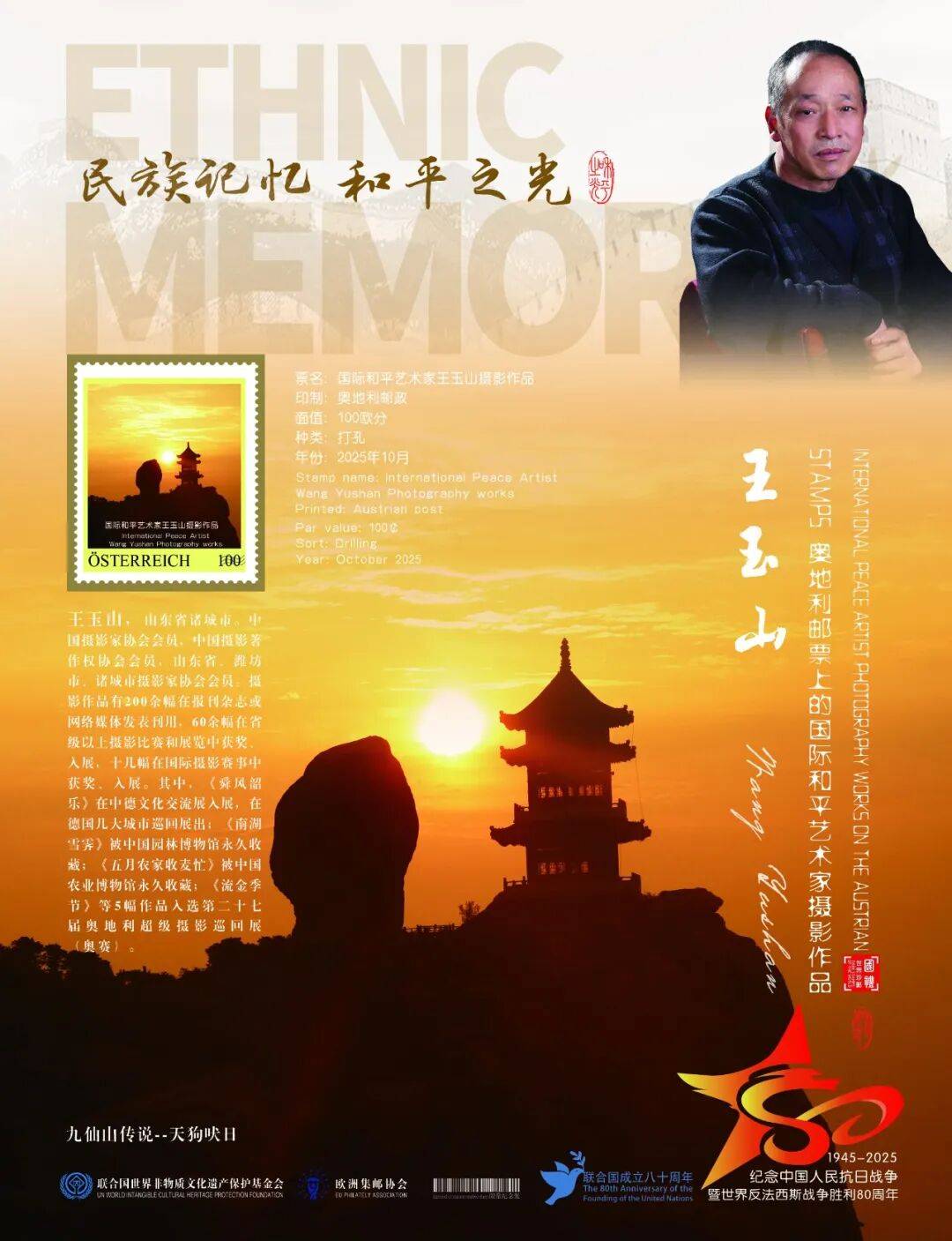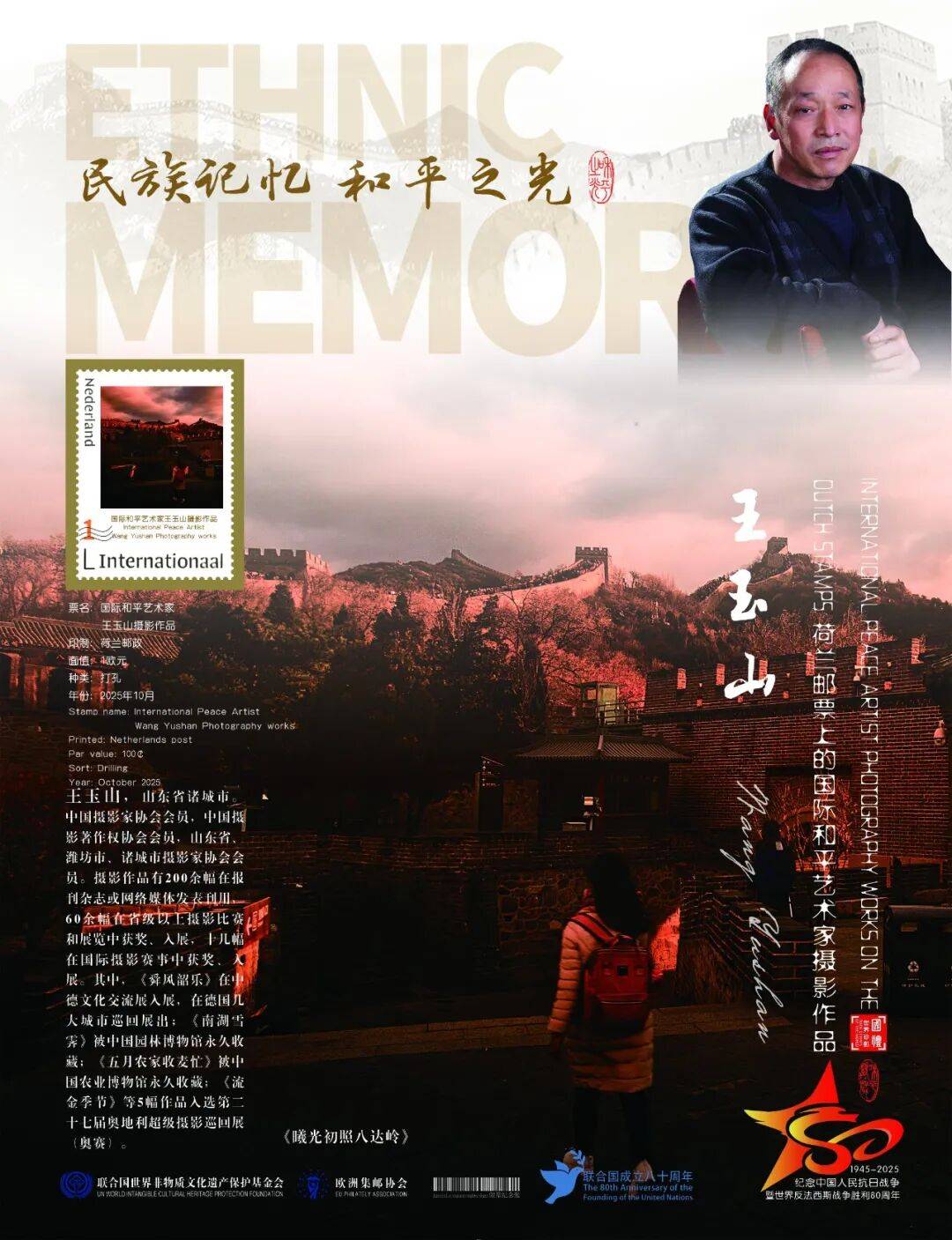 同时,联合国邮政、德国邮政、奥地利邮政、荷兰邮政为中国摄影名家王玉山在全球公开发行一套以纪念中国人民抗日战争暨世界反法西斯战争胜利80周年“民族记忆 和平之光——国际和平艺术家”为主题的邮票与珍藏册。以邮为媒,方寸之间让世界各地的人们感受到爱与和平的力量,并为世界和平发展注入新能量。